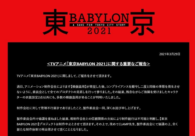 アニメ 東京babylon 21 さらなる 多数の模倣盗用 が発覚し制作中止に 全く新たな制作体制で再出発させて頂くこととなりました ねとらぼ